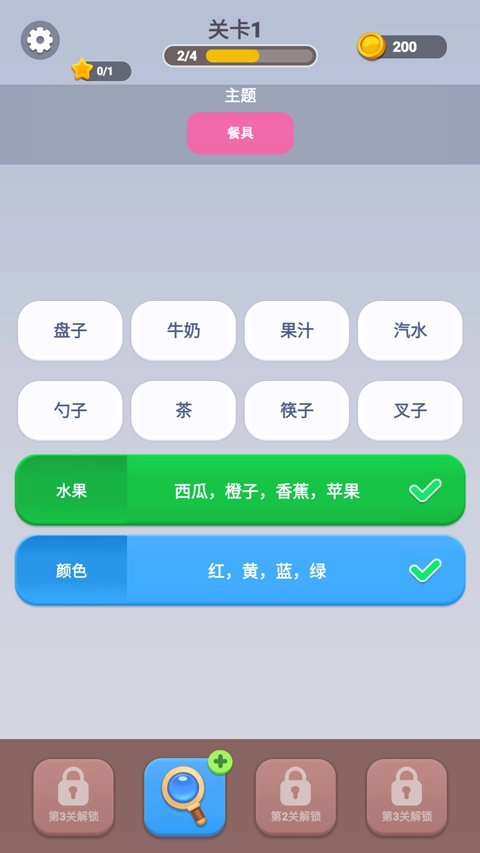 1、观察词汇找关联:每一关都会呈现大量词汇,需要认真观察,发现它们彼此间的共同之处或者分类依据。