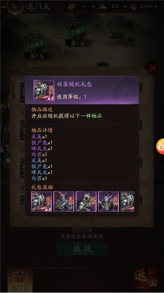 通关时会掉落初级神君元魄、神通宝箱、八卦牌这类材料,对神君的养成很有帮助。