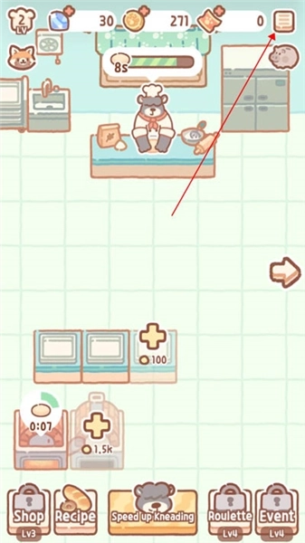 1、进入游戏后,可以通过左右两侧的箭头来切换房间,左边是面包制作,右边是面包售卖和发放传单招揽客人以及休息室等地方