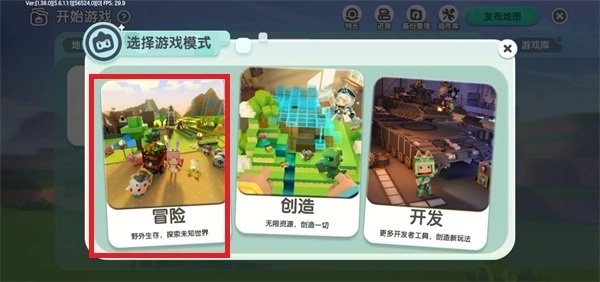 3、然后在选择游戏模式的界面中,只需要选择【冒险】就可以体验生存模式,该模式为生存冒险模式;