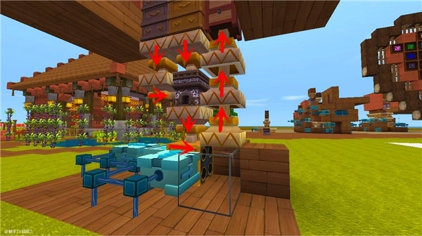 6、最后的安装步骤啦,最后我们需要安装四块尾翼方块,摆放在铰链方块的旋转面,一侧摆放两个,注意摆放的朝向: