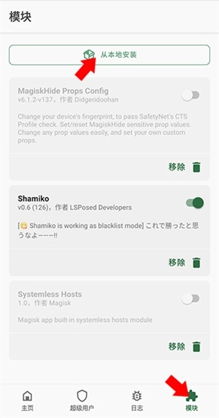 1、第一步要安装Shamiko模块,先准备好Shamiko模块的压缩包,打开Magisk应用后点击底部的模块页面,接着点击顶部的“从本地安装”选项,找到Shamiko模块压缩包进行安装即可(安装结束后需要重启手机)