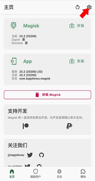 2、接下来要进行屏蔽列表的配置,这和上方提到的24.2版本操作类似但存在些许差异,首先进入Magisk首页,点击顶部的设置按钮。
