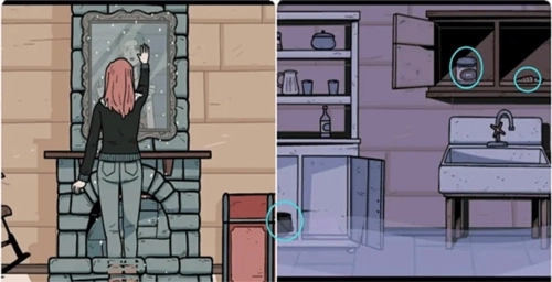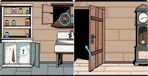 2、推开那扇蓝色的门进入盥洗室,依据照片上的提示来摆放架子上的罐子,完成这一步后取走下方的「钥匙」。随后打开水池上方的柜子获取「对讲机」,再离开盥洗室,用钥匙打开钟表左边的门。
