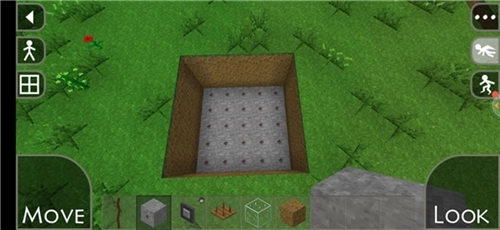 2、第一步先挖一个坑,大小可以自己定,这里拿5×5的坑来举例,往下挖四格后,在最底层铺上穿线石。