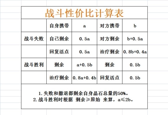 同样,从这张表中我们能发现一个规律:假设你自己携带的晶石数量是100,那么只要对方携带的晶石超过50,单从晶石数量来看,打赢对方后至少不会亏本。这个说法可能有点绕,换个更直白的方式讲就是:如果你身上的晶石数量是对方的两倍以上,主动发起决斗是不划算的。比如你带了200晶石,对方带了80晶石。你主动点对方决斗,打赢后你会有240晶石,对方还是80晶石。但对方可以直接带着80晶石回到复活点,而你治疗后反而只剩下192晶石,这样算下来其实是亏了。