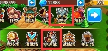 1、首先,开启护送战玩法需要村长大人的等级达到15级,可通过游戏主界面顶端的【战役】→【护送站】入口进入。