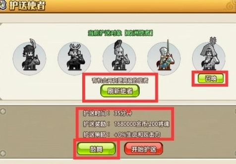 在挑选护送使者的界面里,你能从5个使者当中随机选1个,而且每天有三次免费刷新的机会。