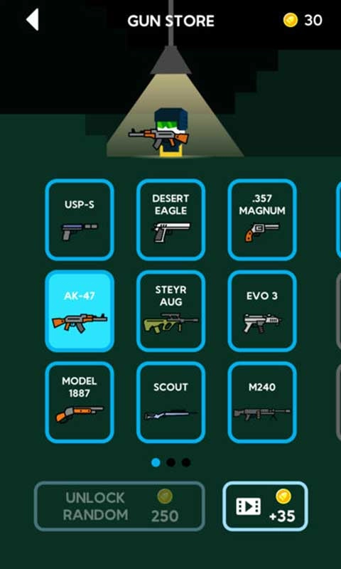 游戏里能使用各式各样的枪械,玩家可以看到像素风格的冲锋枪与步枪。