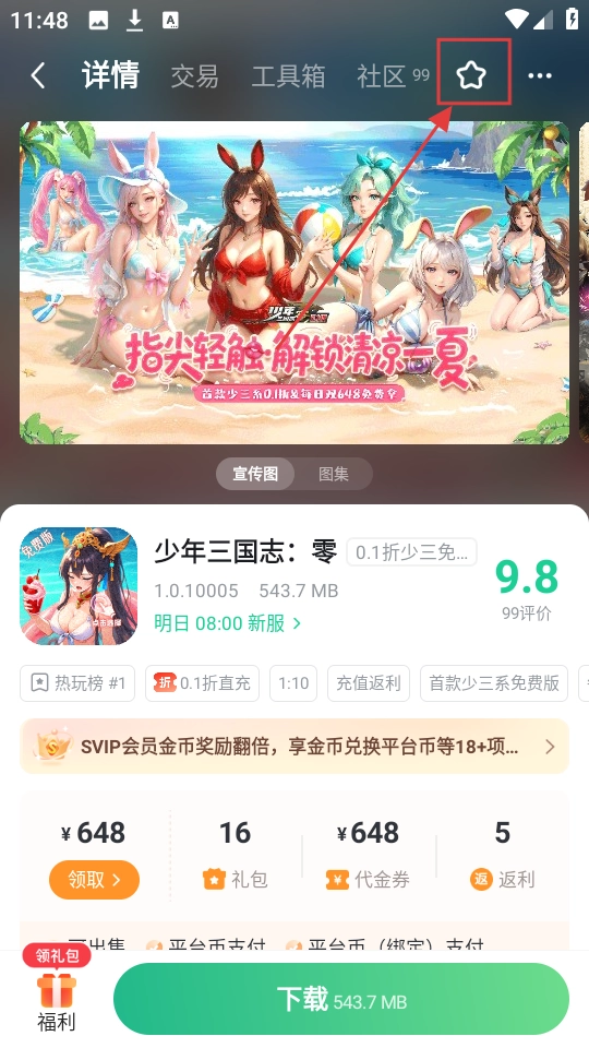 进入游戏详情页后,点击右上角的星形收藏图标,就能把《少年三国志:零》加入收藏了。