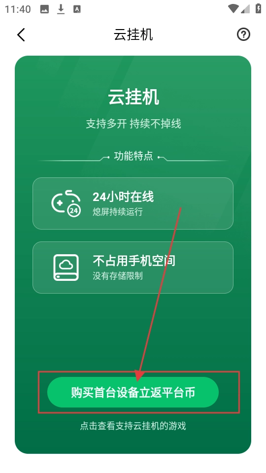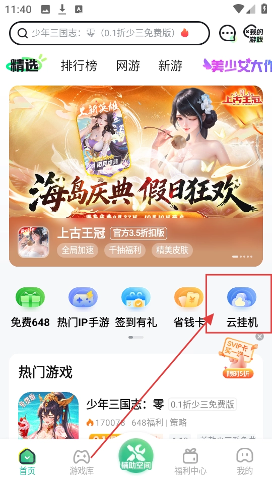 在首页找到【云挂机】选项,点击该选项即可进入云挂机页面,进而了解云挂机的相关功能。