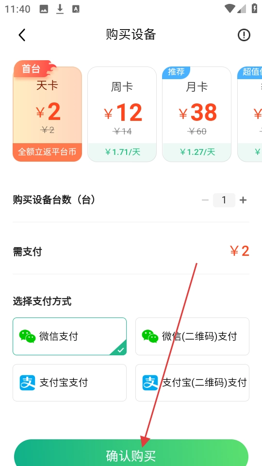 在设备选购页面,确定好设备的使用时长、所需台数以及支付方式后,点击【确认购买】按钮即可完成支付流程。