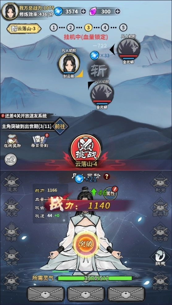 3、进行突破提升战斗力,开始更加危险的修仙冒险。