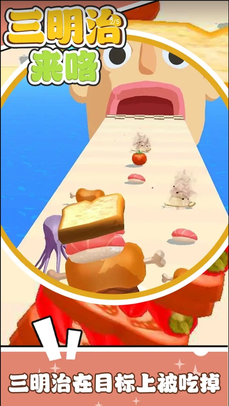 4、3D卡通风格画面,简单的操作玩法,尽享乐趣闲暇时,三明治的延展性很强,玩家可以自由选择配菜,提升三明治的口感。