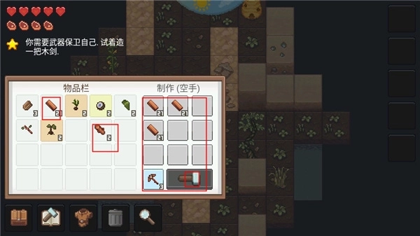 3、进入游戏后,系统会通过教程引导你完成每一步操作,老规矩,想致富得先从砍树开始。先放倒一棵树,制作一把木斧,然后多砍几棵树储备材料。(需要把材料逐个拖到制造栏里:树枝徒手能加工成木棍,原木可以加工成木板;加工完成后一定要把成品拖回背包,不然很可能会丢失。如果不想等加工的进度条,点一下叉号就能跳过。)