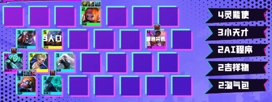 2、羁绊组合:4灵能、3小天才、2AI、2吉祥、2淘气包、2爱心使者、2福牛、2秘术、2黑客、1平民