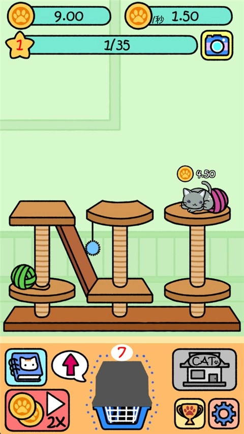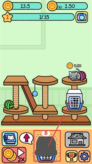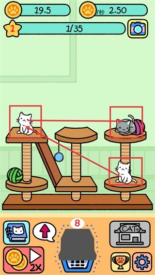 箱子放置好后,猫爬架会吸引来多只猫咪(像第二张图里的白猫和灰猫),这时候猫爪币的数量和每秒收益会一起增加,收益资源也就这样持续累积起来了。