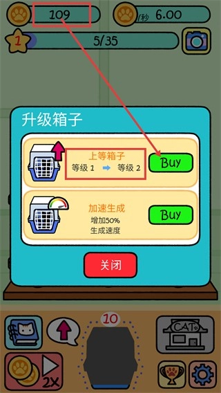 4、当猫爪币积累到足够数量时,进入【升级箱子】界面,点击【Buy】按钮升级“上等箱子”,以此进一步提高猫爪币的获取效率。