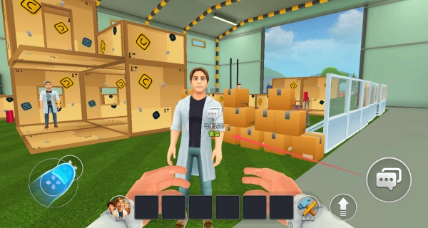 1、借助左侧的虚拟摇杆操控角色在实验室里移动,和场景中的教授们进行对话来获取任务。
