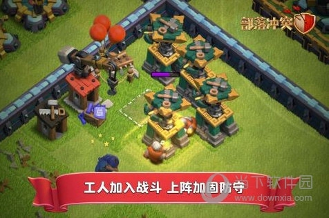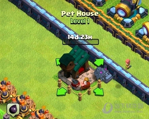 宠物小屋、研究所、城堡、天鹰会各占一处位置,剩下的两个空位建议留给工人小屋——毕竟单个工人小屋的秒伤差不多能追上箭塔,而且战斗时建筑工人还能修复建筑。14本更新带来的两大变化,无论是战宠系统还是建筑工人机制,都值得大家重点关注。