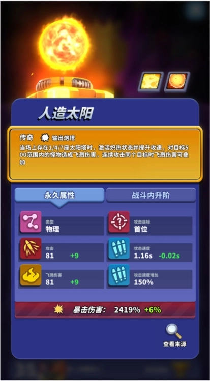 人造太阳具备强劲的溅射伤害效果,且该伤害能够叠加。当防御塔数量分别达到1座、4座、7座时,会依次激活溅射功能并提升攻击速度。搭配反应堆提供的增益BUFF与重构带来的增伤BUFF,其输出能力将变得极为强大。