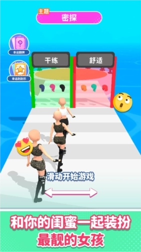 3、你可以通过左右滑动屏幕来操控角色的移动方向,然后依据不同的主题为角色搭配合适的衣服。