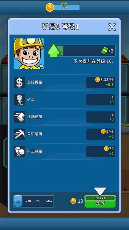游戏初期,玩家需要手动点击来推动业务起步,积累到初始资金后,就可以招募专业的管理人员,让矿山采集实现自动化运营。值得一提的是,每位矿工都拥有独特的技能,通过合理的升级强化,能够显著提高采集效率。除此之外,升级挖掘设备、聘请监工和矿山经理、使用强力道具等操作,都能有效加快矿业的发展速度。