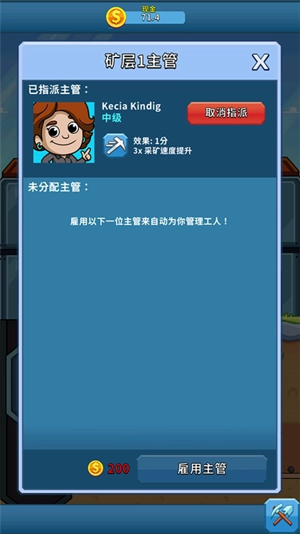 游戏里可以聘请监工、矿山经理这类管理人员,他们会自动监督工人作业,玩家不用总是手动点击操作。随着游戏的进行,还能解锁更高级的管理人员,让管理效率得到进一步提升。