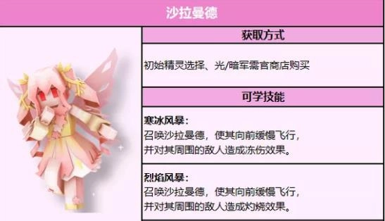 输出精灵:输出精灵这边推荐沙拉曼德,要是已经加入光阵营的话可以直接领取,完成两天的任务就能免费拿到这只精灵。它的两个技能差异不大,所以选择哪个都可以。