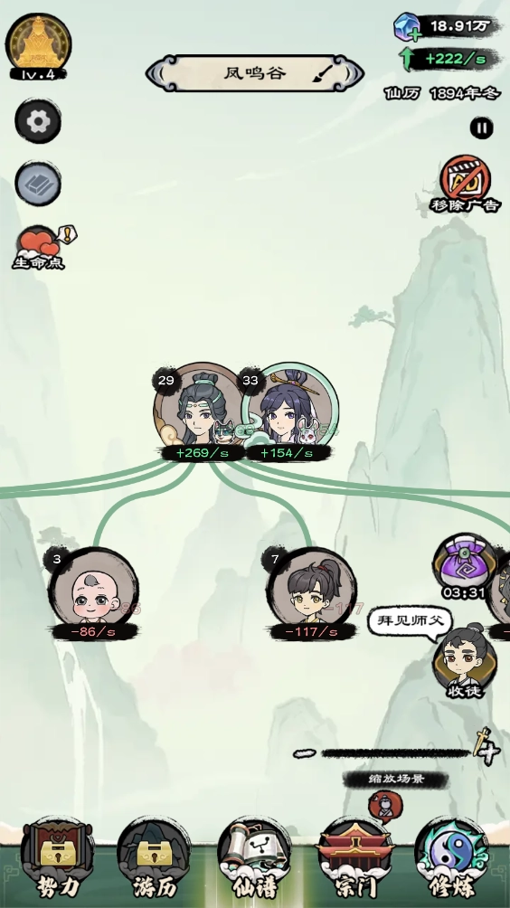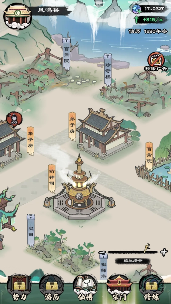 宗门:等级达到3级后解锁,可在此处建造各类设施,并安排弟子入驻修炼。