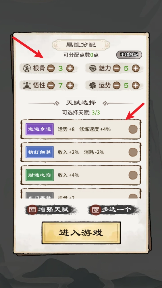 在游戏正式开始前,你能够先为自身的各项属性分配点数,接着挑选合适的天赋来开启游戏。