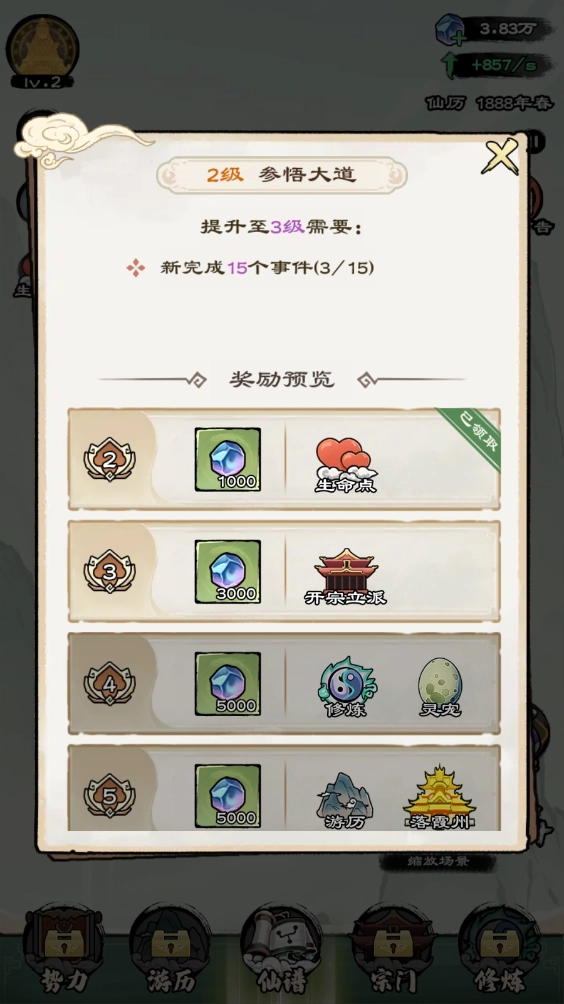 通过修炼,我们能持续参悟大道,提升自身的大道等级,从而解锁更多功能。