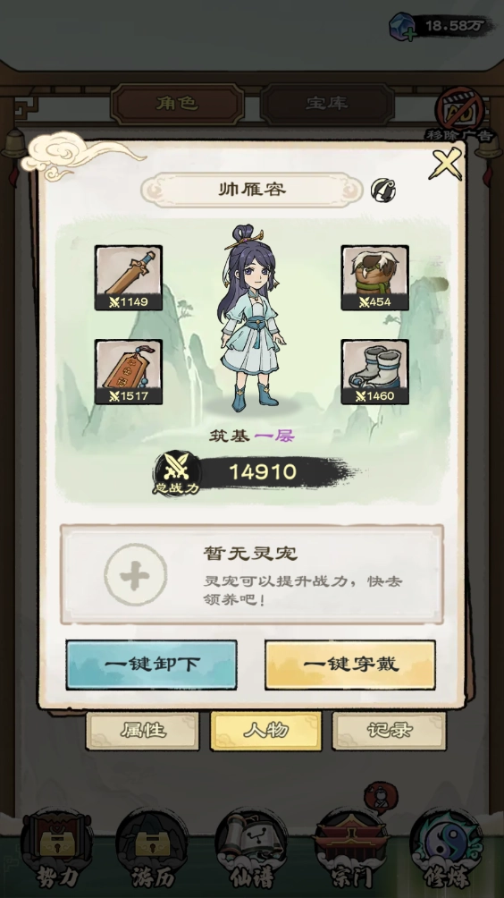 装备系统:玩家可通过参与战斗或前往灵宝店购买装备,以此增强弟子的战斗力。