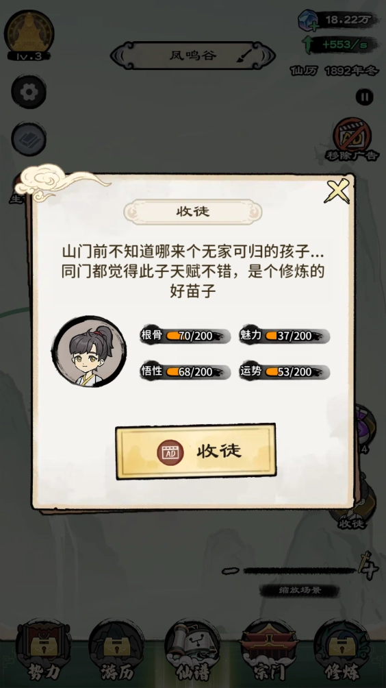 收徒:游戏的右侧会时不时弹出收徒提示,可以自由的选择是否接纳。