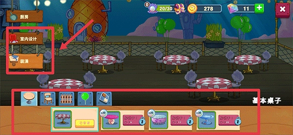 在比基尼堡的各式餐厅与厨房中探索,解锁更多美味菜谱,以此吸引顾客前来用餐消费。