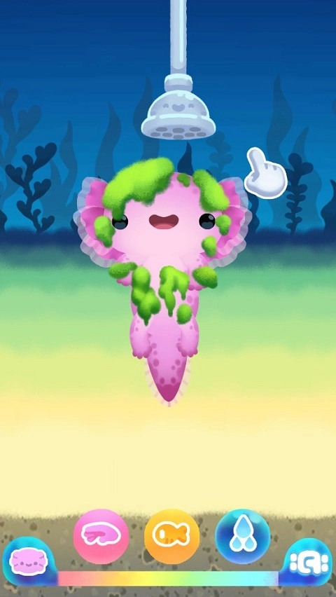 除了抚摸和喂食,还得定期给蝾螈清理身上的泥垢,操作方法是点击“水滴”图标,然后拖动花洒就能完成清理了。