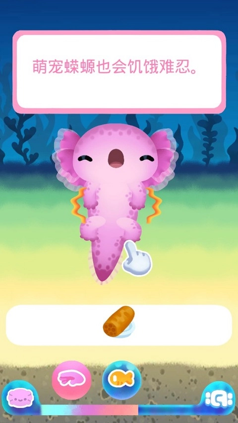 当然啦,任何生物都得吃东西,萌萌的蝾螈也不例外,它们饿起来也会很难受。所以第二步要点击“鱼”来喂食,具体怎么操作呢?把食物拖到蝾螈的嘴巴里就可以啦。
