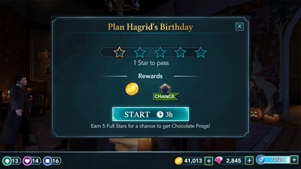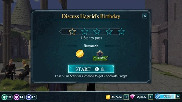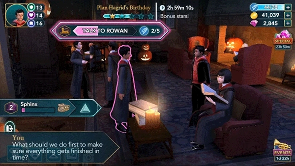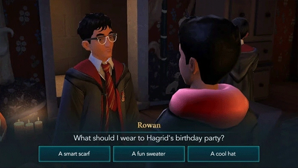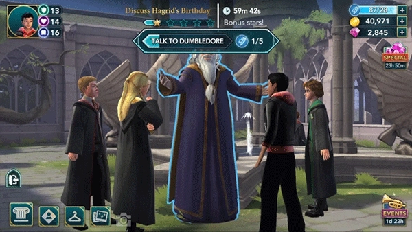 这次演练会以一名二年级学生的视角来介绍游戏。考虑到一年级及以上的学生都能参与冒险活动,所以依据你目前主要故事的推进情况,部分任务的星级与属性要求或许会存在差异。等你抵达那里后,就能和一些学生进行互动了。点击他们头顶的对话气泡,听听他们想跟你说些什么。随后,邓布利多会告知你海格的生日即将来临,他希望你能帮他筹备一场惊喜派对。