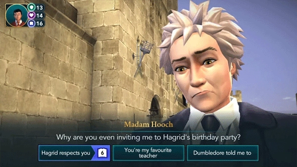 下课后,你要和胡奇夫人聊聊海格的生日派对。她会好奇你邀请她参加的原因,你可以给出三种不同的回答方式。尽管每个选项带来的最终结果都一样,但选第一个选项能得到10个知识点和5个学院分,所以推荐你选这个选项。