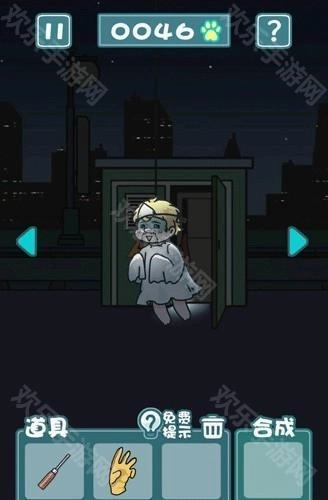 去变电房的右下角拿胶皮手套,再把它和最左侧路灯下面的螺丝刀拼到一块儿,就能做成绝缘螺丝刀啦。等幽灵大叔走了之后,用这把绝缘螺丝刀把电箱修好。然后去最左边卖猫粮的大叔那里拿个毛线团,把毛线团放在最右边的路灯下面,换个场景再回来,就能看到猫咪了。
