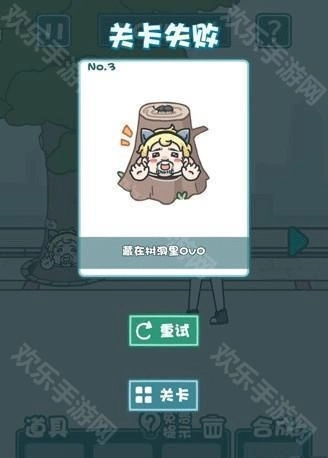 首先从最右侧的椅子上取到一串气球,回到左边点击树洞,即便出现任务失败的提示也无需担忧。随后点击大叔头顶的独角仙,把独角仙交给中间的小男孩来获取捕虫网。将捕虫网与气球一同交给主角后,会出现一个向上的箭头,点击该箭头后再点击捕虫网里的猫咪就能通关。