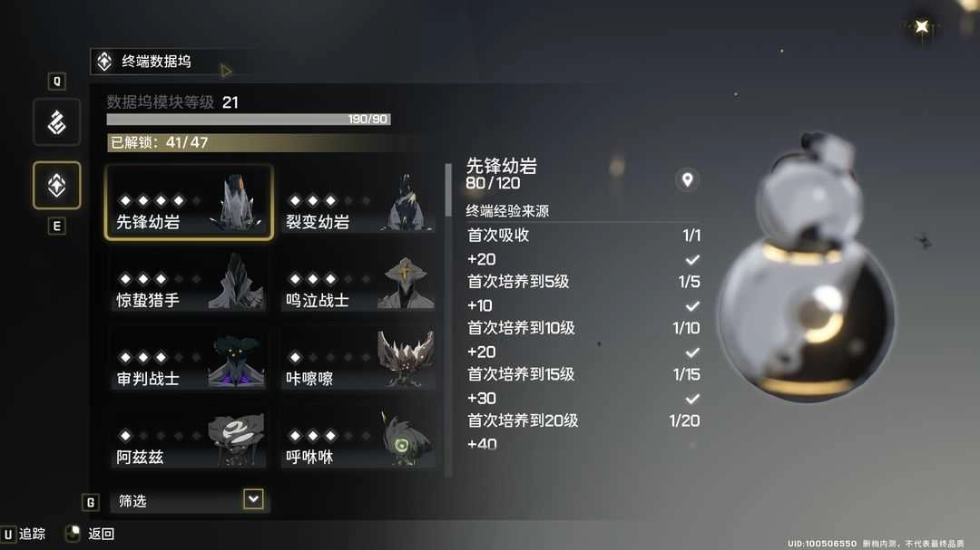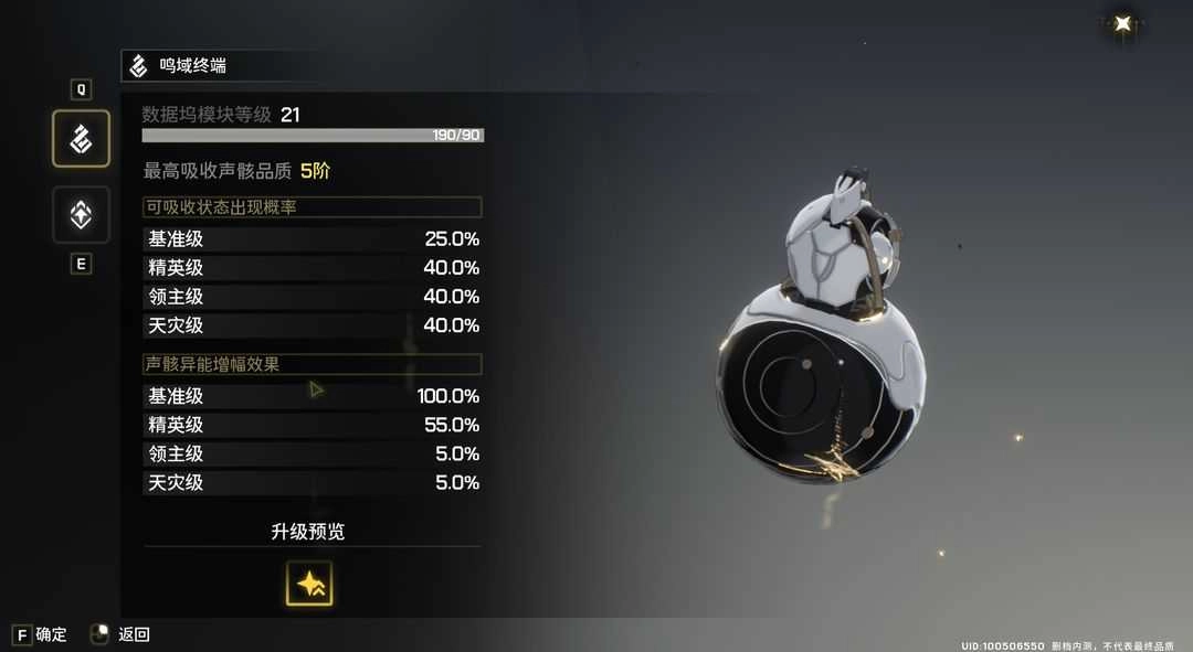 建议大家优先将鸣域终端提升至21级,这样就有机会捕捉到金色品质的声骸,并且能显著增强声骸属性。具体效果可参考下图。声骸分为基准、精英、领主、天灾四个等级,等级越高提供的属性加成越强。击败怪物有一定概率掉落对应声骸,品质从低到高为绿、蓝、紫、金,每个品质可分别强化至5、10、15、20级。