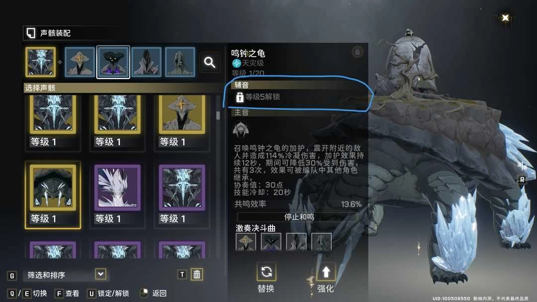 声骸系统类似传统游戏中的装备体系,设有五个装备位,包括一个主音和四个辅音,同时具备套装效果。五个声骸的强化等级总和会带来额外的属性加成。