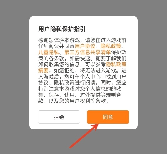 1、感谢您体验本游戏,请您在进入游戏前仔细阅读并同意用户协议、隐私政策、儿童隐私保护政策及第三方信息共享清单的各条款。若您想快速、扼要地了解我们如何收集您的信息,可参考隐私政策摘要。如您拒绝同意,将无法进入游戏。
