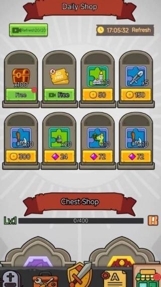 3、每日商店、宝箱商店与技能升级系统,为玩家提供了道具兑换和战力强化的途径,进一步丰富了游戏的养成维度与耐玩性。