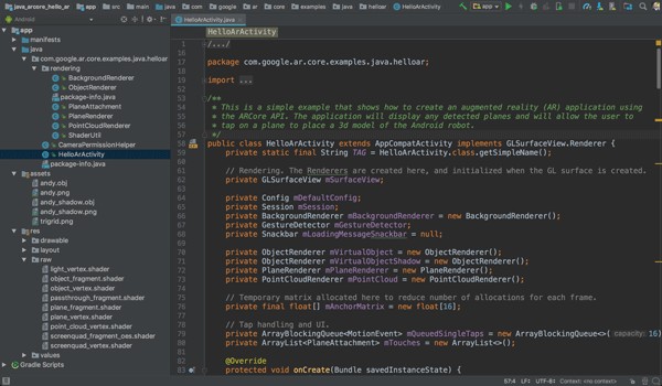 若要开始在Android设备上使用ARCore,您可运行ARCore SDK所附带的hello_ar_kotlin或hello_ar_java示例应用程序。这些示例应用运用了OpenGL,它是一种用于渲染2D与3D矢量图形的编程接口。这些应用能够展示检测到的所有平面,并且允许用户点击平面以放置3D模型。