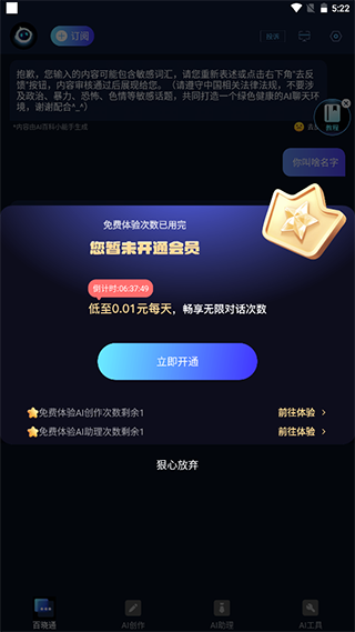 当然,用户依旧能够免费体验一次应用的AI创作、AI助理等功能。