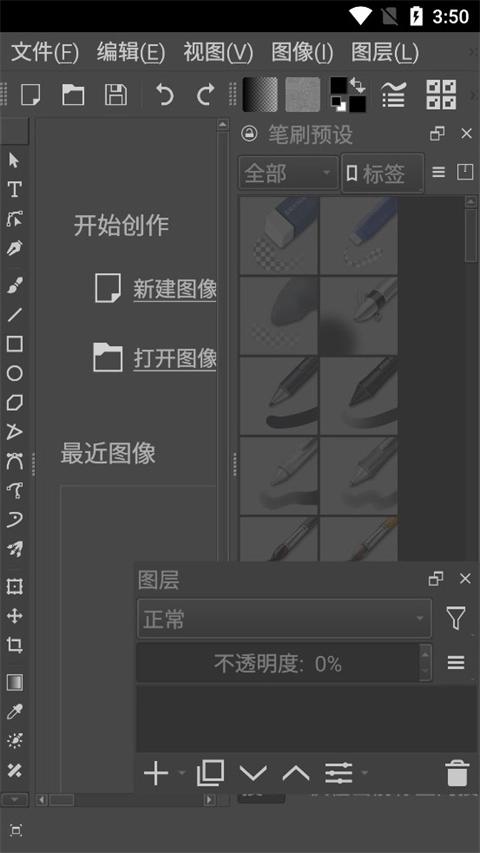 当用户首次从本站启动Krita后,窗口中央不会马上显示画布视图。此时,若要打开画布视图,需新建或打开一个图像。在欢迎屏幕点击“新建图像”,或者前往主菜单选择“文件” - “新建”,Krita便会弹出新建图像对话框。要是想打开已有的文件,既可以在欢迎屏幕点击“打开图像”,也能前往主菜单点击“文件” - “打开” ,另外,还能直接把图像文件从系统的文件管理器拖进Krita软件窗口。