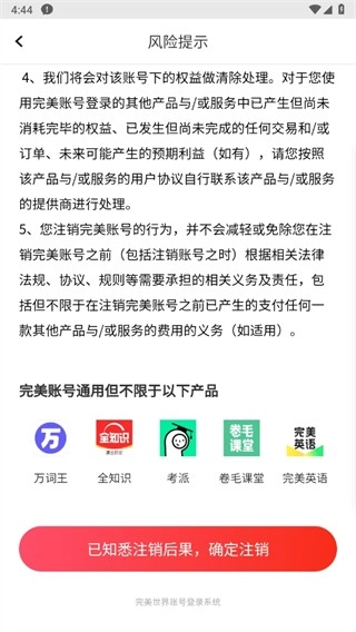 4、用户点击后,便会进入风险提示页面,此时直接点击【已知悉注销后果,确定注销】按钮,就能成功注销账号。