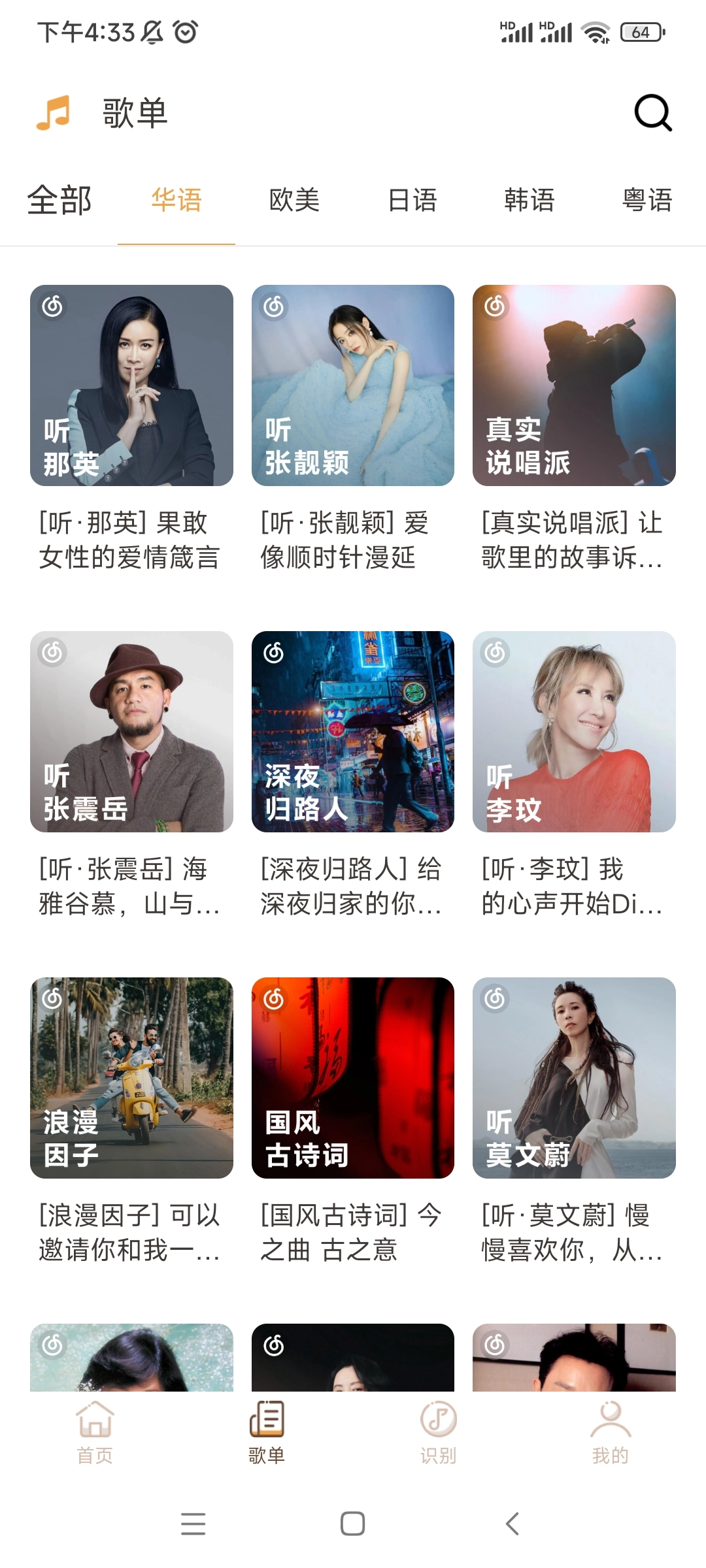 4、歌单资源:以分类形式呈现华语、欧美、日韩等不同地区歌手的作品,便于素材筛选及练习使用。